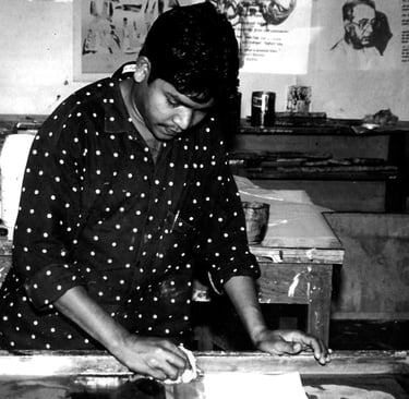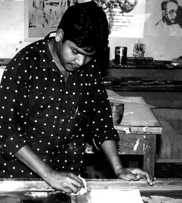 Jangarh Singh Shyam (1962–2001) was a visionary Pardhan Gond Adivasi artist from Patangarh, Mandla (Madhya Pradesh), who rose from a life of poverty and minimal formal education to become a pathbreaking figure in contemporary Indian art. Discovered in 1981 by artist J. Swaminathan for his striking village murals, he moved to Bharat Bhavan in Bhopal, where he began working with paper, canvas, acrylics and ink, shifting Gond painting from ritual wall art into a gallery-ready, contemporary form.